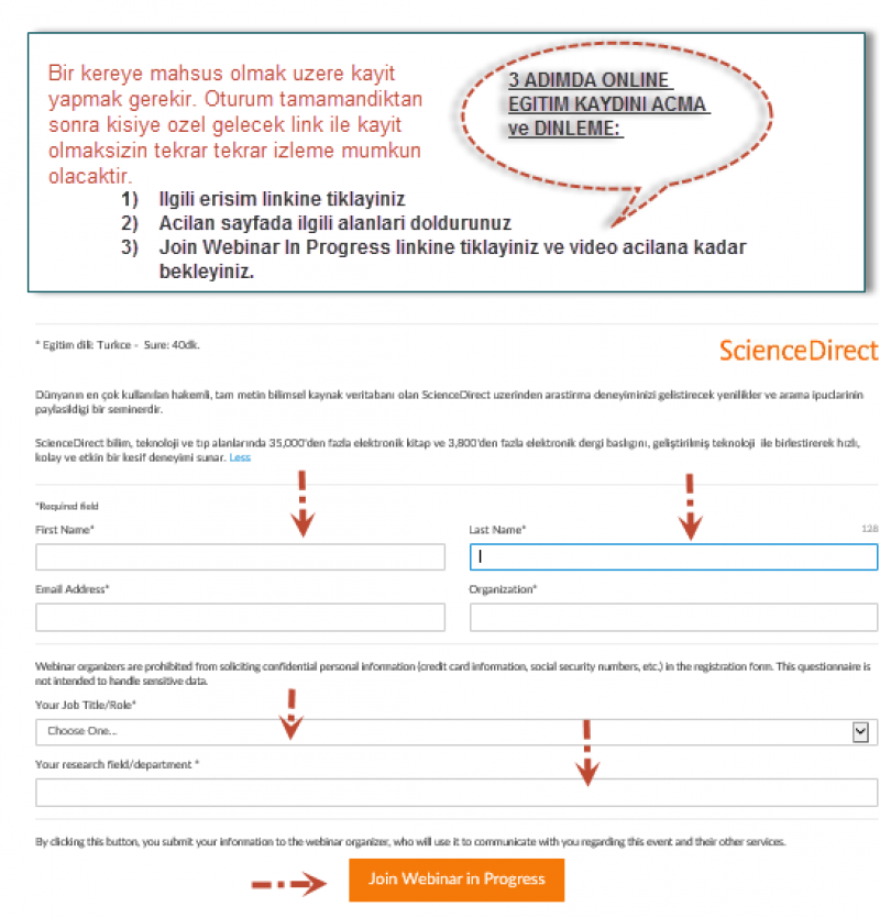 Kurumunuzdaki araştırmacı ve öğrencilerin, akademik çalışmalarını daha etkin ve hızlı bir şekilde yürütmeleri amacıyla TUBITAK ULAKBIM EKUAL Projesi kapsaminda sağlanan ELSEVIER bilimsel veritabanı ve araştırma çözümlerinin daha verimli bir şekilde kullanımını sağlamak ve yeni özellikleri hakkında bilgi vermek amacıyla gecen hafta gerceklesitirilen tüm eğitimler kayda alınmış olup ve hem kaçıran hem de yeniden izlemek isteyen kullanıcılarınız aşağıda belirtilen linkler üzerinden 7/24 erişebilir.