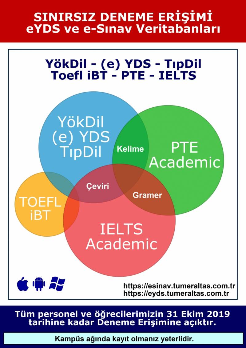 Tümer ALTAŞ A.Ş. Sınav Hazırlık ve Dil Eğitimi veritabanı e-YDS/YDS, YÖKDİL, TIPDİL, PTE, IELTS, TOEFL iBT sınavlarına hazırlık amacıyla oluşturulmuş bir veritabanıdır. Yeni versiyonu olan e-Sınav ile birlikte iki farklı şekilde sunulmaktadır. Mobil ve web platformlarında kullanılabilir. Tüm öğrenci ve akademik/idari personelimizin 31 Ekim 2019 tarihine kadar sınırsız deneme erişimine açılmıştır.