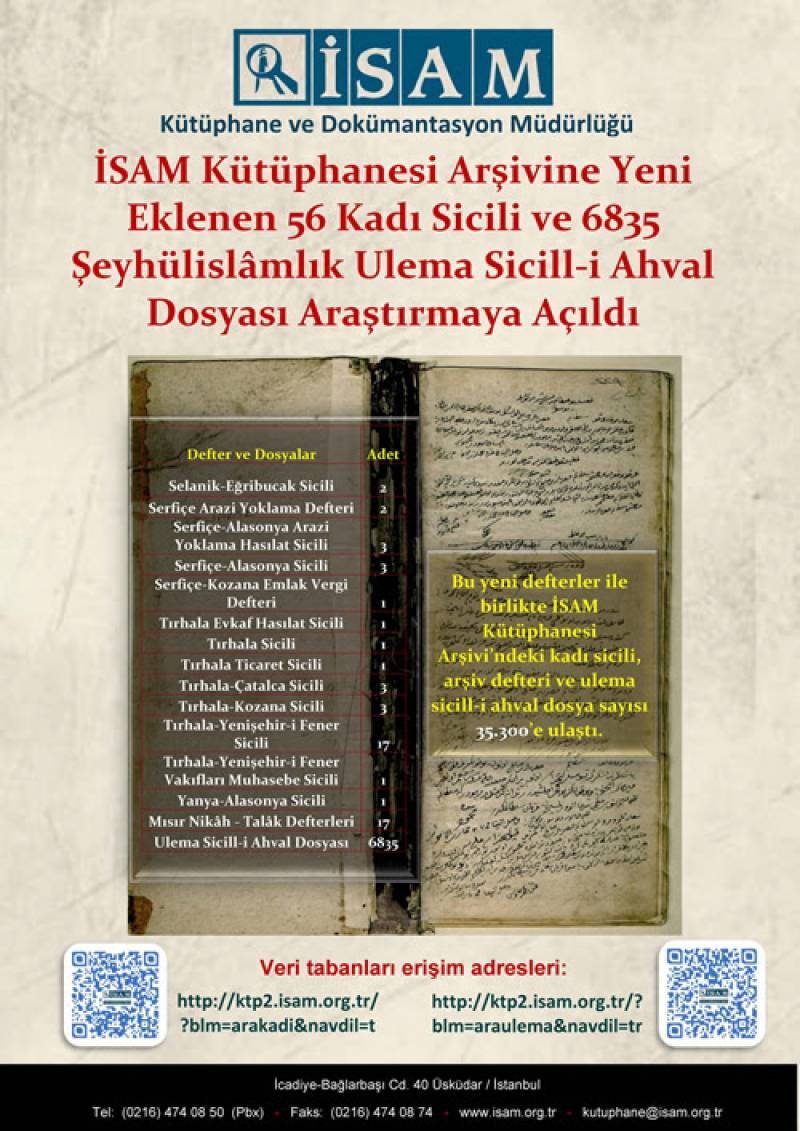 Muhtelif arşivlerden temin edilen 56 kadı sicili ve arşiv defteri ile Meşihat Arşivi’nden temin edilen 6.835 Şeyhülislâmlık (Bâb-ı Meşihat) Ulema Sicill-i Ahval dosyası İSAM Kütüphane ve Dokümantasyon Müdürlüğü’nce tasnif edilerek kullanıma açıldı.
